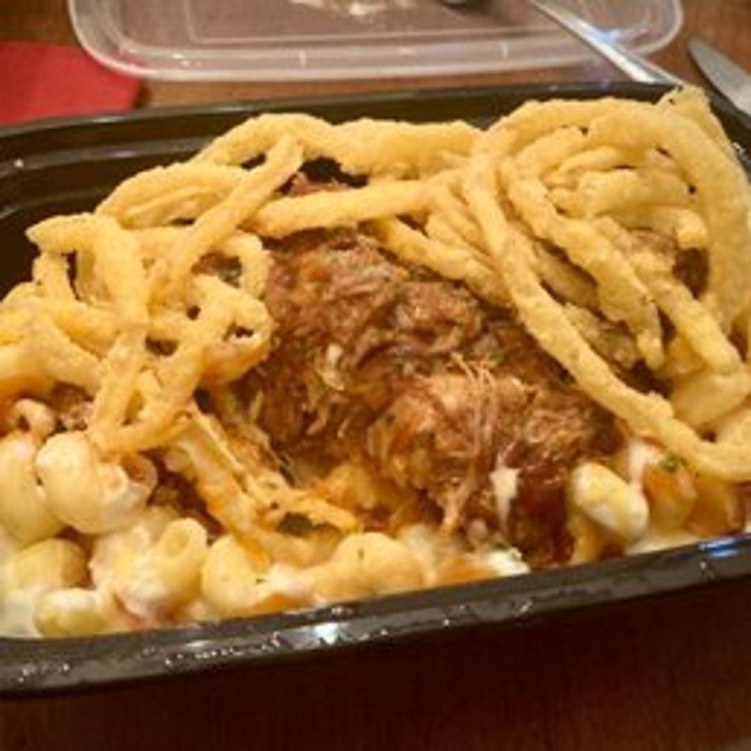 Slow-cooked pulled pork tossed in BBQ sauce, piled high on a toasted bun, and served with coleslaw and your choice of side.