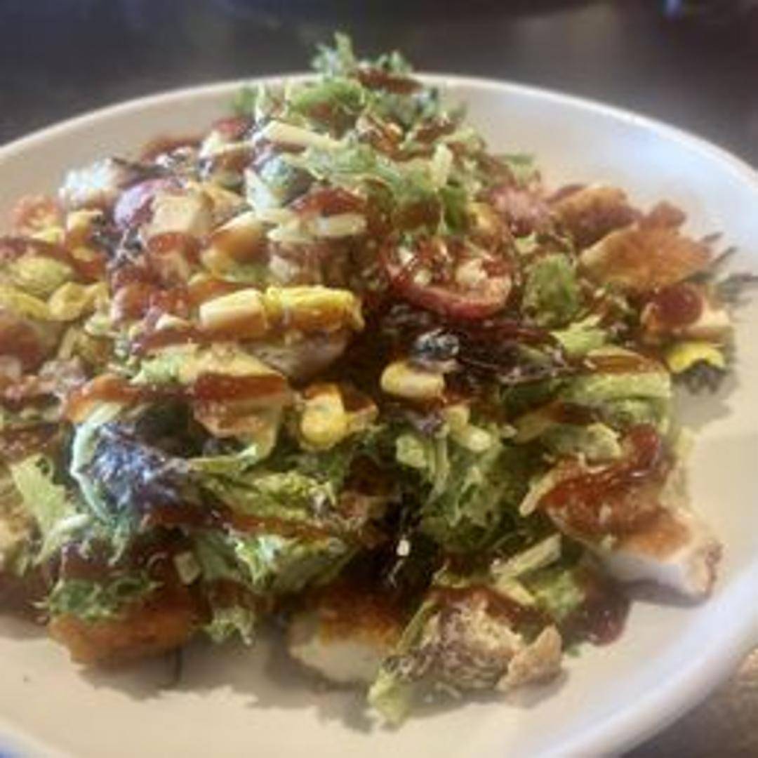 Grilled chicken breast glazed with BBQ sauce, served atop a bed of crisp mixed greens with corn, black beans, tomatoes, cheddar cheese, and crispy tortilla strips. Finished with a creamy ranch dressing.
