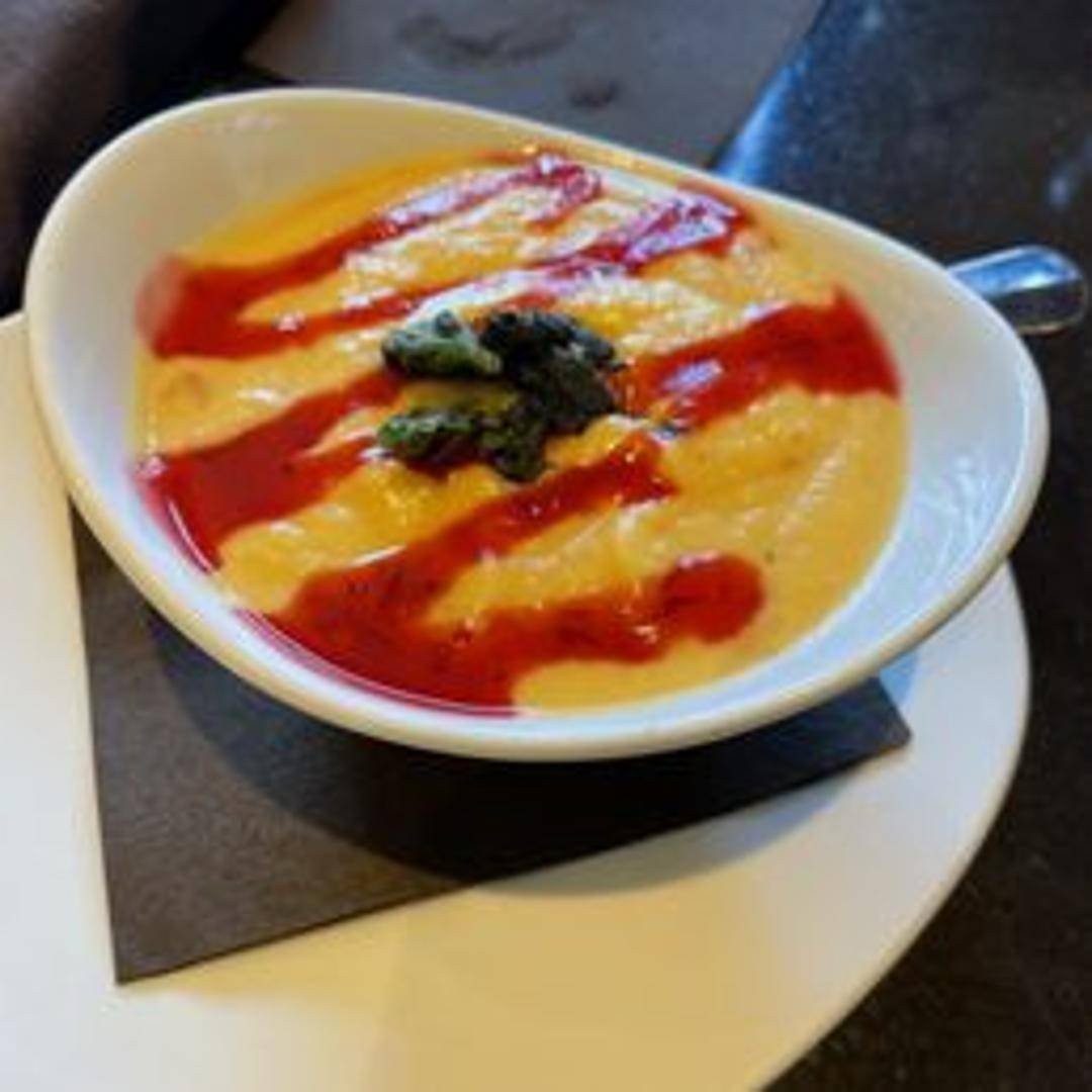 Creamy and comforting butternut squash soup, seasoned with warming spices and a touch of sweetness. Served with a swirl of cream and toasted pumpkin seeds for added texture.