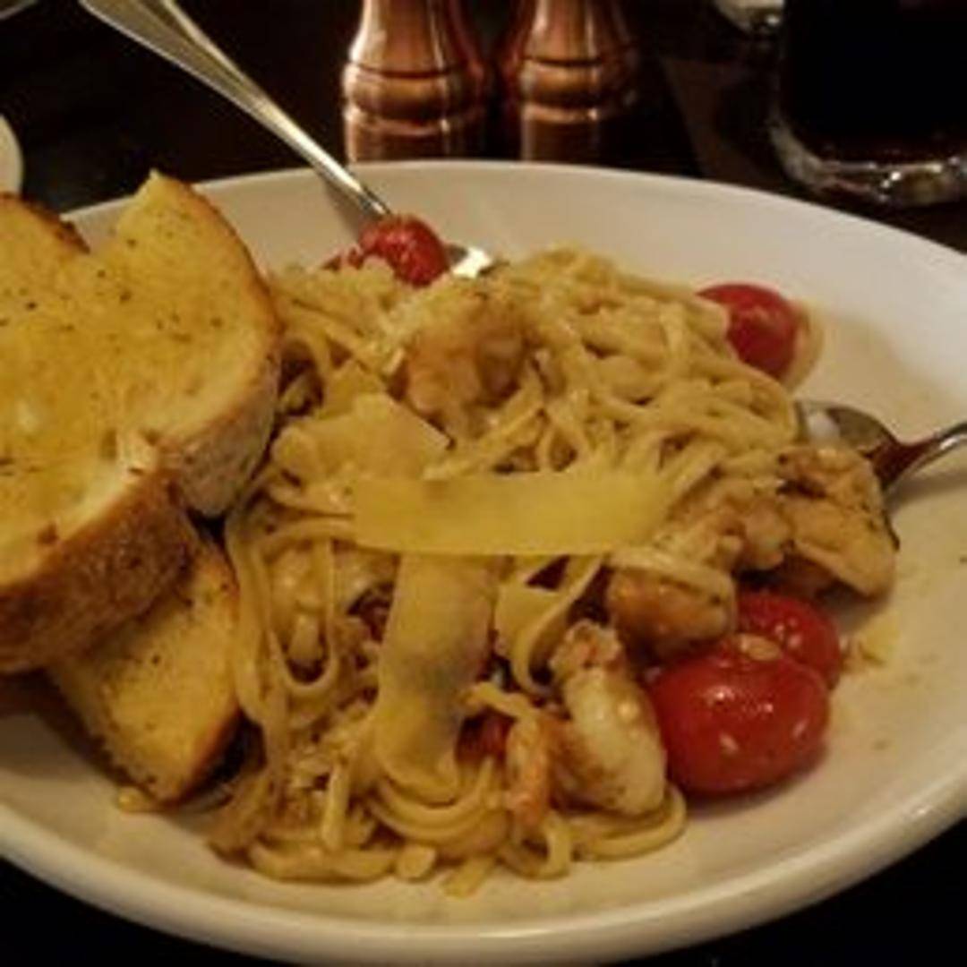 Linguini pasta with shrimp and clams, served in a white wine garlic sauce, garnished with fresh parsley.