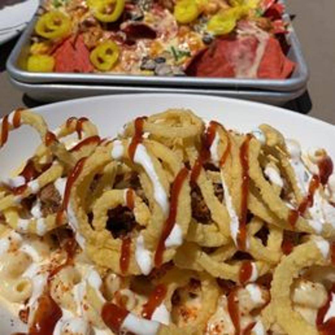 Creamy mac and cheese topped with tender, slow-cooked pulled pork. A savory combination of classic comfort food and smoky barbecue flavors.