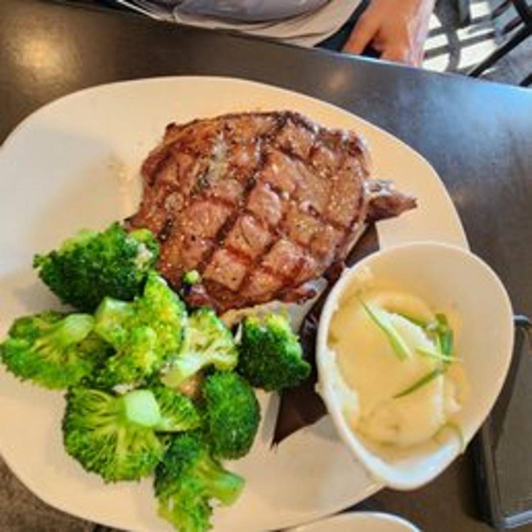 A grilled ribeye steak, known for its rich marbling and flavorful taste. Typically served with a choice of sides, such as mashed potatoes, seasonal vegetables, or french fries. Cooked to your preferred temperature.