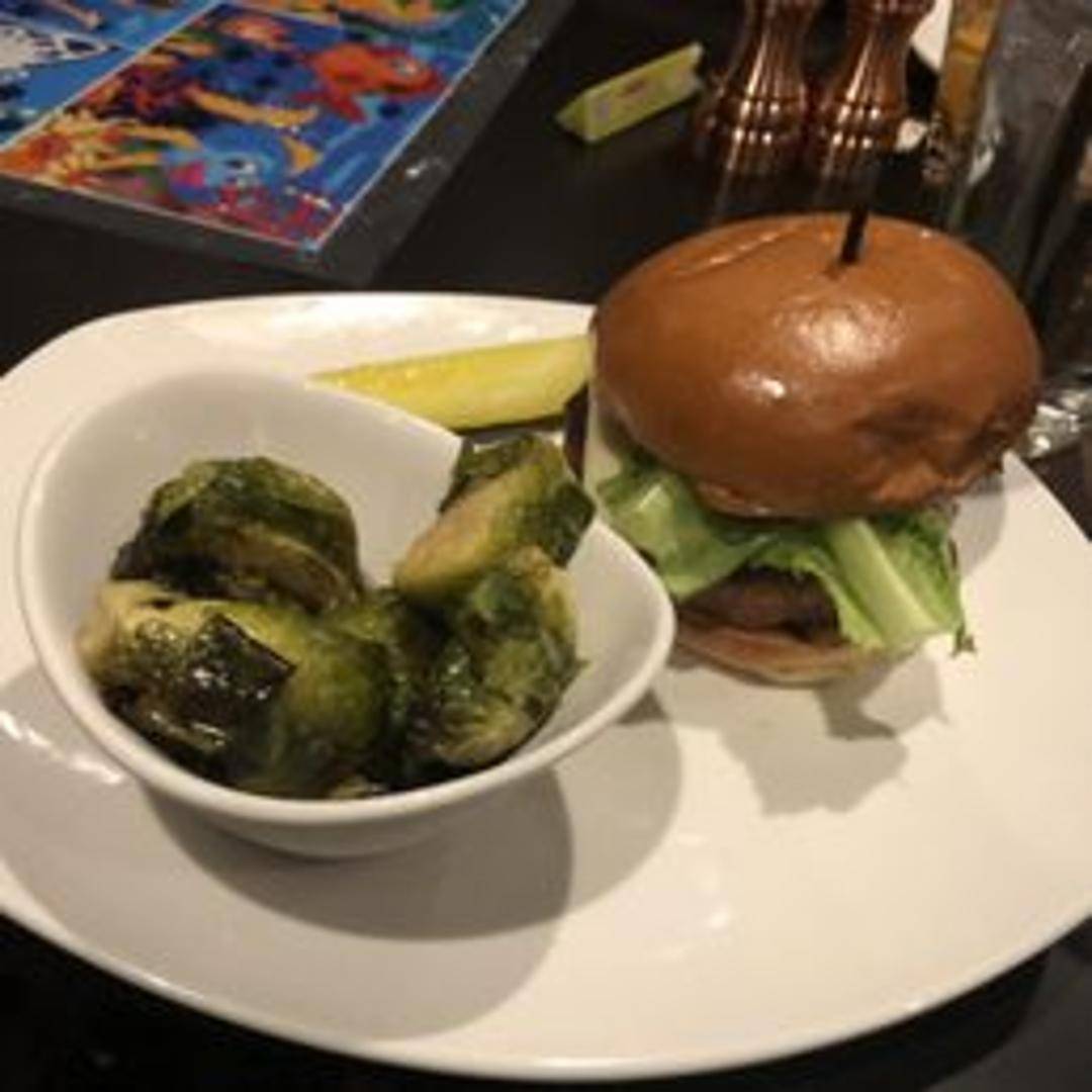 A plant-based burger patty made from soy and potato proteins, topped with lettuce, tomato, onion, and your choice of cheese and condiments on a toasted bun. A vegetarian and vegan-friendly option.