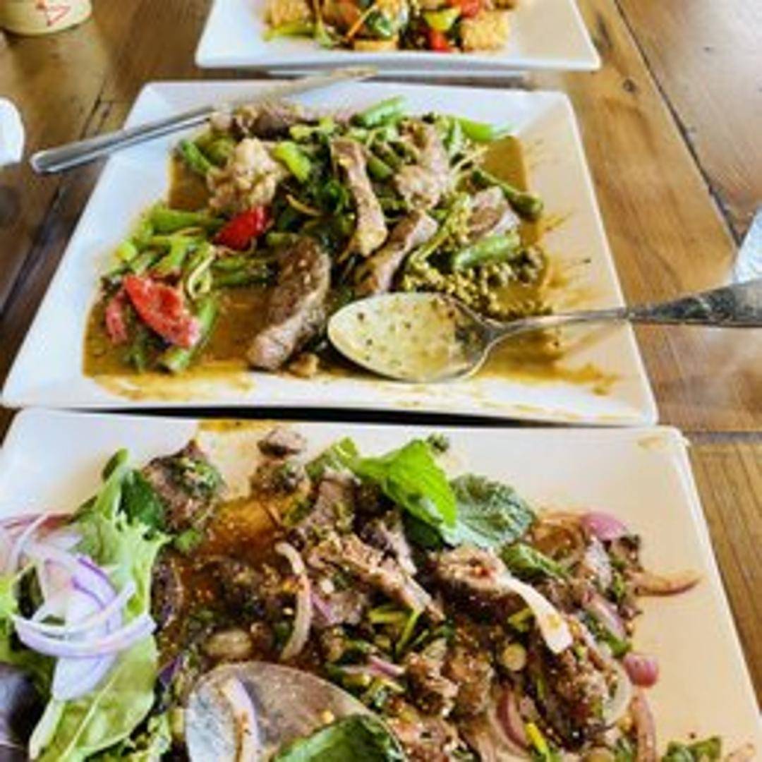 Tender slices of beef stir-fried with green beans, bell peppers, and a flavorful emerald green curry sauce. Served with steamed jasmine rice.