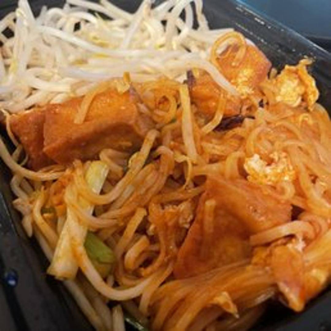 Classic Thai stir-fried rice noodles with shrimp, chicken, or tofu, bean sprouts, egg, and green onions in a tangy tamarind sauce. Garnished with crushed peanuts and a lime wedge.