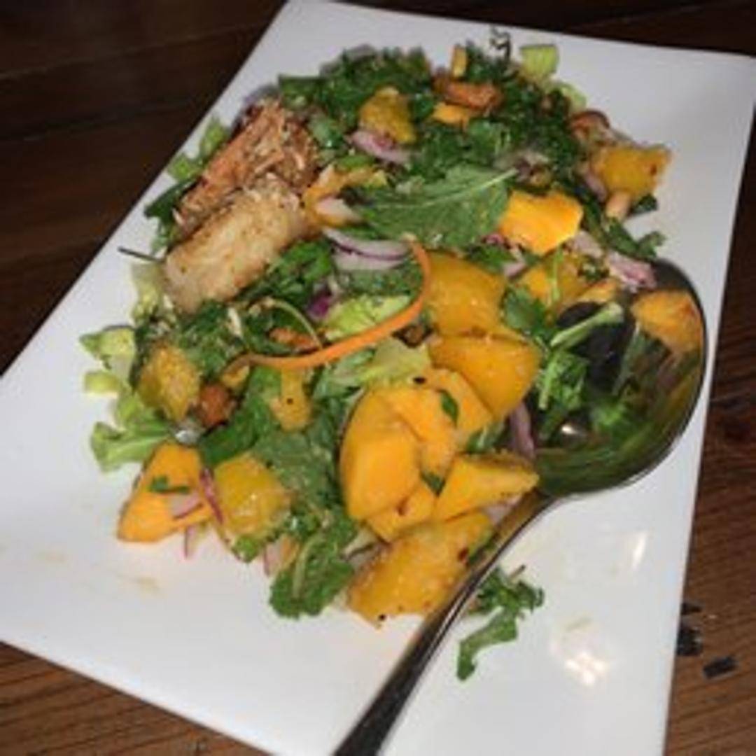 A refreshing and tangy Thai salad featuring fresh mango, red onion, cilantro, mint, roasted peanuts, and a vibrant lime dressing. May contain chili flakes for a touch of spice.