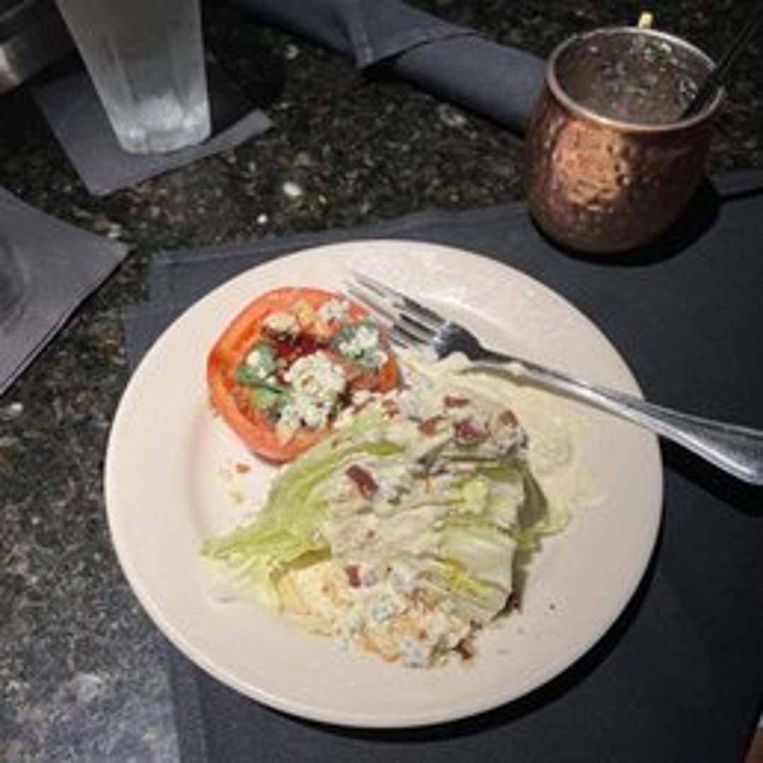 Crisp iceberg lettuce wedge topped with creamy bleu cheese dressing, bacon, chopped tomatoes, and bleu cheese crumbles.