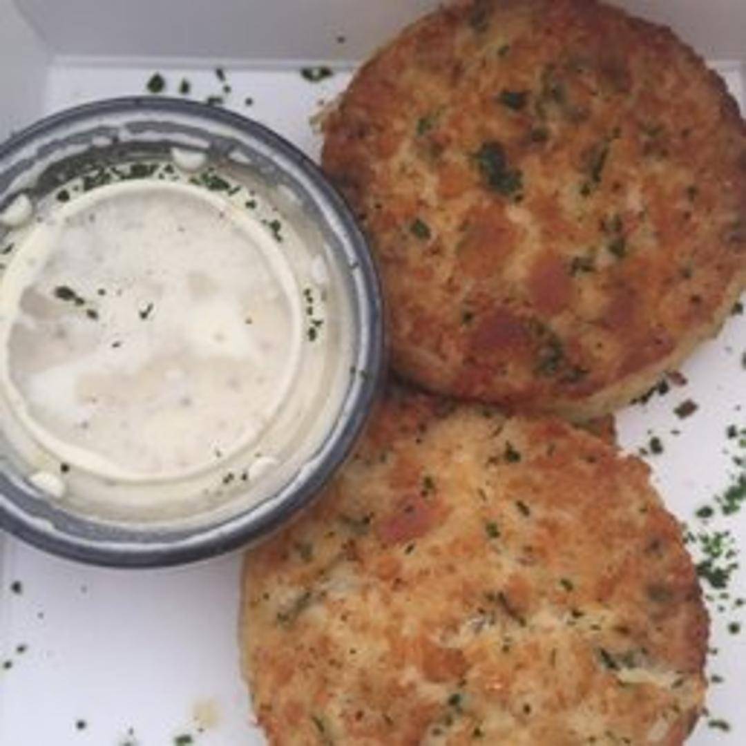Lump crab meat cakes, lightly breaded and pan-seared to a golden brown. Served with a complementary sauce and garnish.