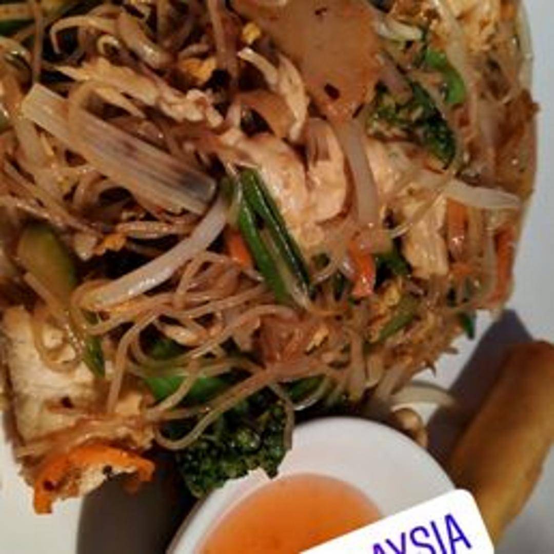 Thin rice noodles stir-fried with shrimp, chicken, vegetables, and a flavorful curry powder blend. A vibrant and savory dish with a slightly spicy kick.