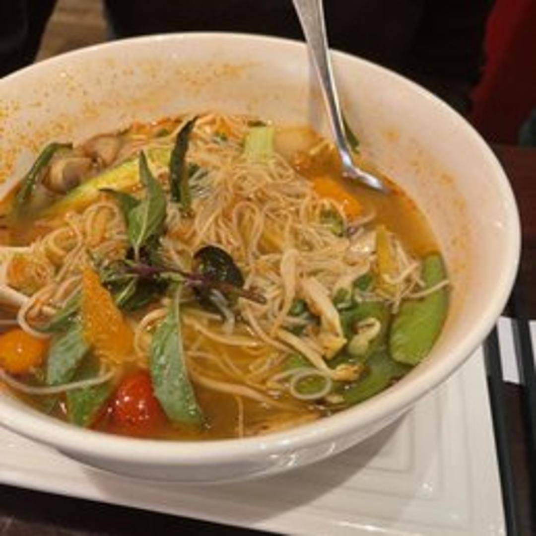 A hot and sour soup originating from Thailand, typically made with broth, lemongrass, galangal, kaffir lime leaves, chilies, fish sauce, lime juice, and often includes shrimp or other seafood. Offers a complex and aromatic flavor profile with spicy, sour, and savory notes.