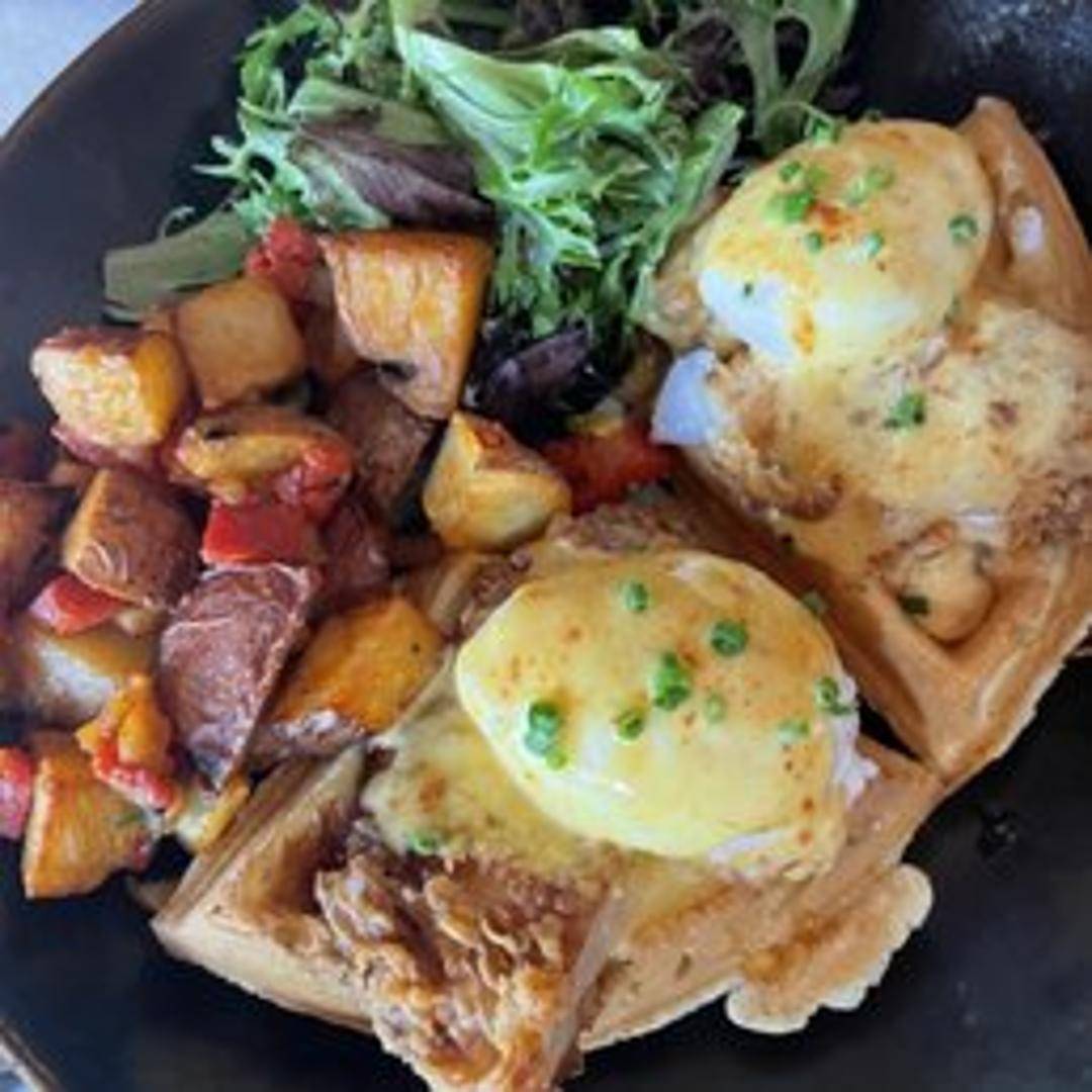Classic breakfast dish featuring poached eggs, Canadian bacon (or ham), and hollandaise sauce, all served on toasted English muffins.