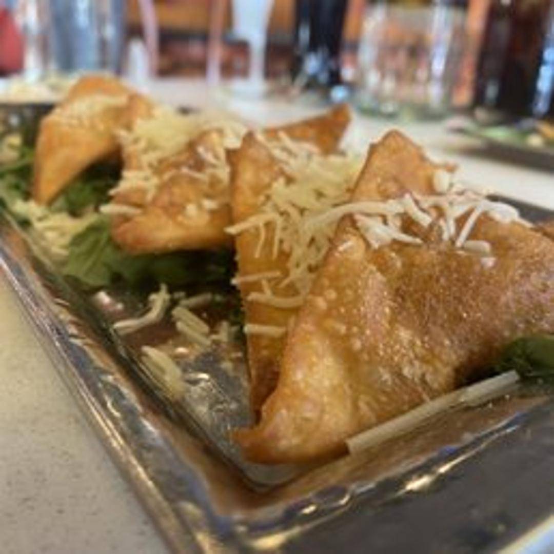 Crispy wonton wrappers filled with a creamy mixture of shredded chicken, buffalo sauce, and cheese. Served with a side of blue cheese dressing for dipping.