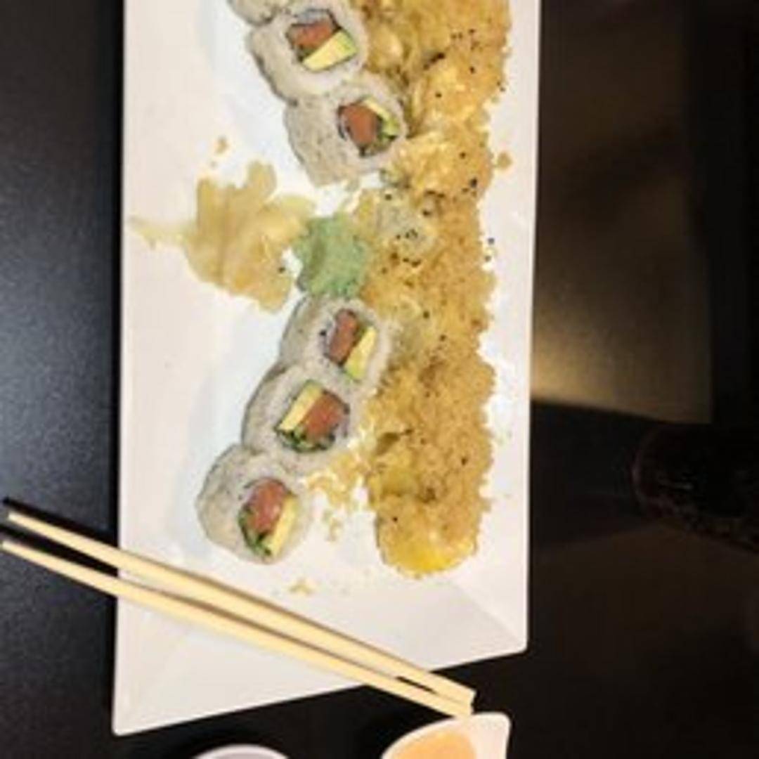 A refreshing sushi roll consisting of cooked shrimp (ebi), mango, and avocado rolled in rice and seaweed. Served with a light and tangy sauce.