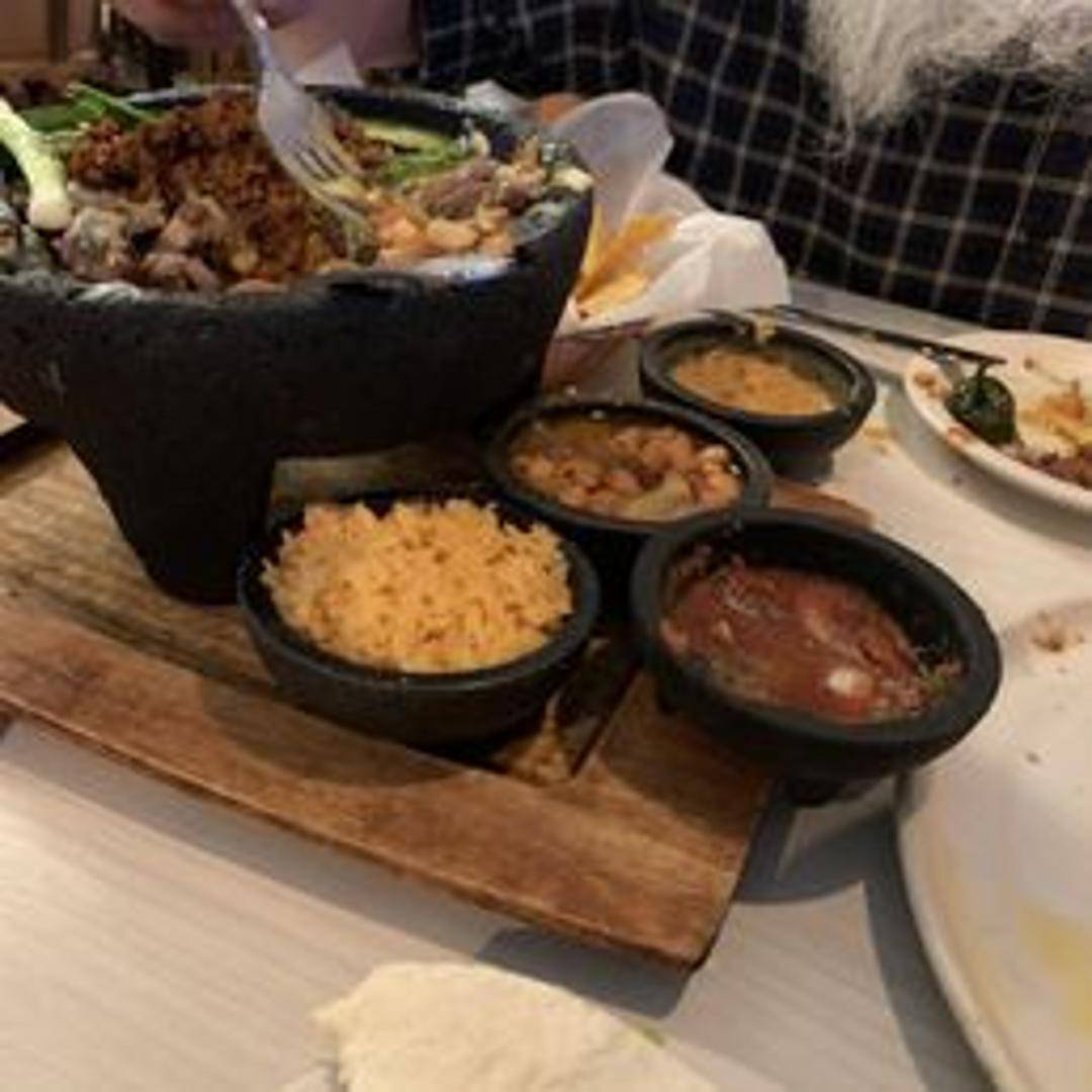 A sizzling stone bowl filled with grilled steak, chicken, shrimp, chorizo, and grilled vegetables in a flavorful sauce. Served with rice, beans, guacamole, sour cream, pico de gallo, and tortillas.