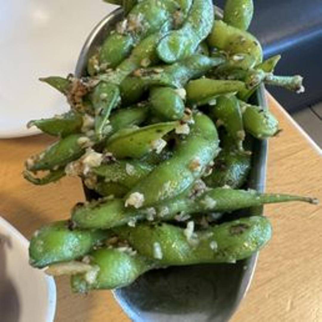 Steamed edamame (soybeans in the pod) tossed with garlic and often other seasonings, offering a savory and slightly salty flavor.