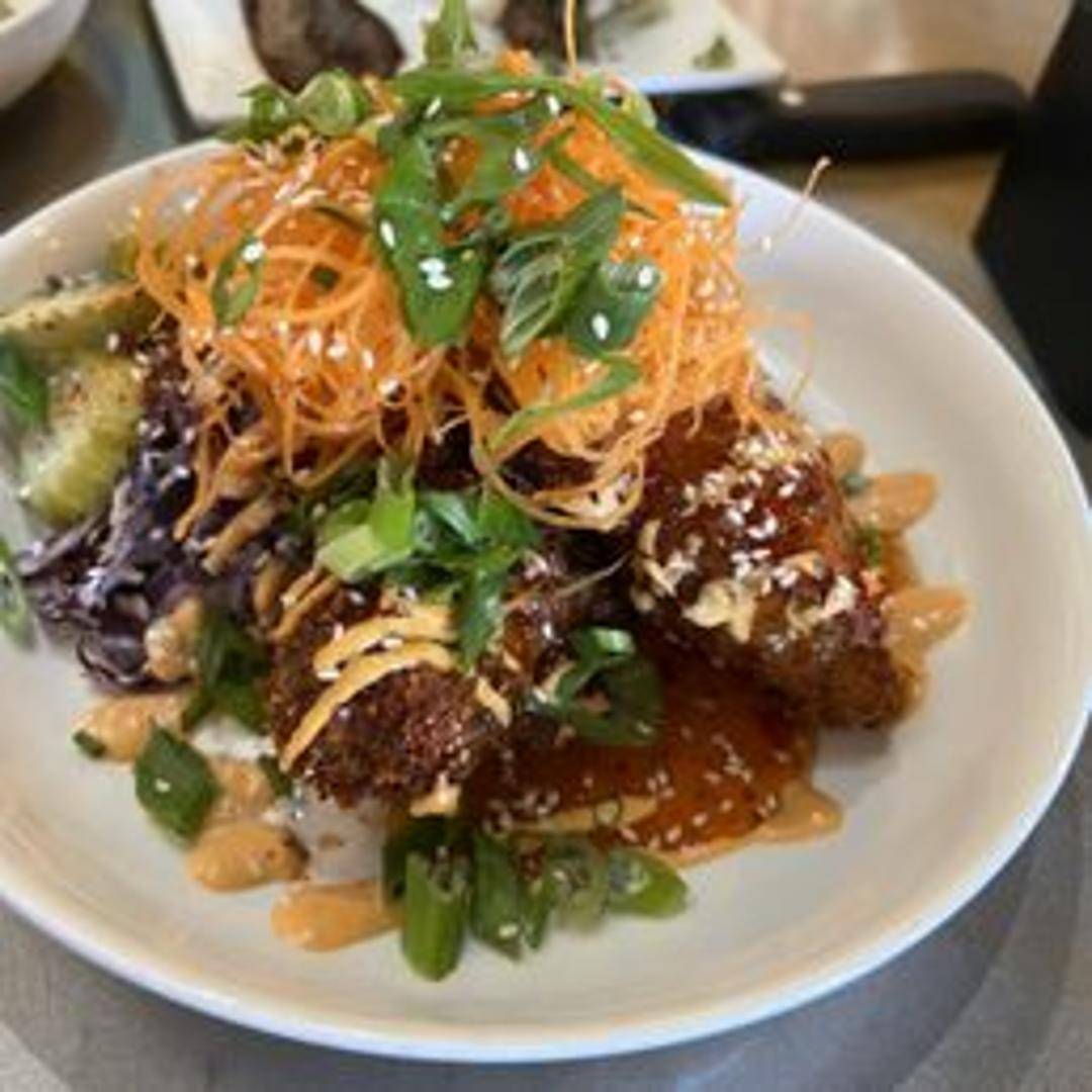 Crispy fried chicken pieces coated in a sweet and spicy Korean Gochujang glaze, often garnished with sesame seeds.