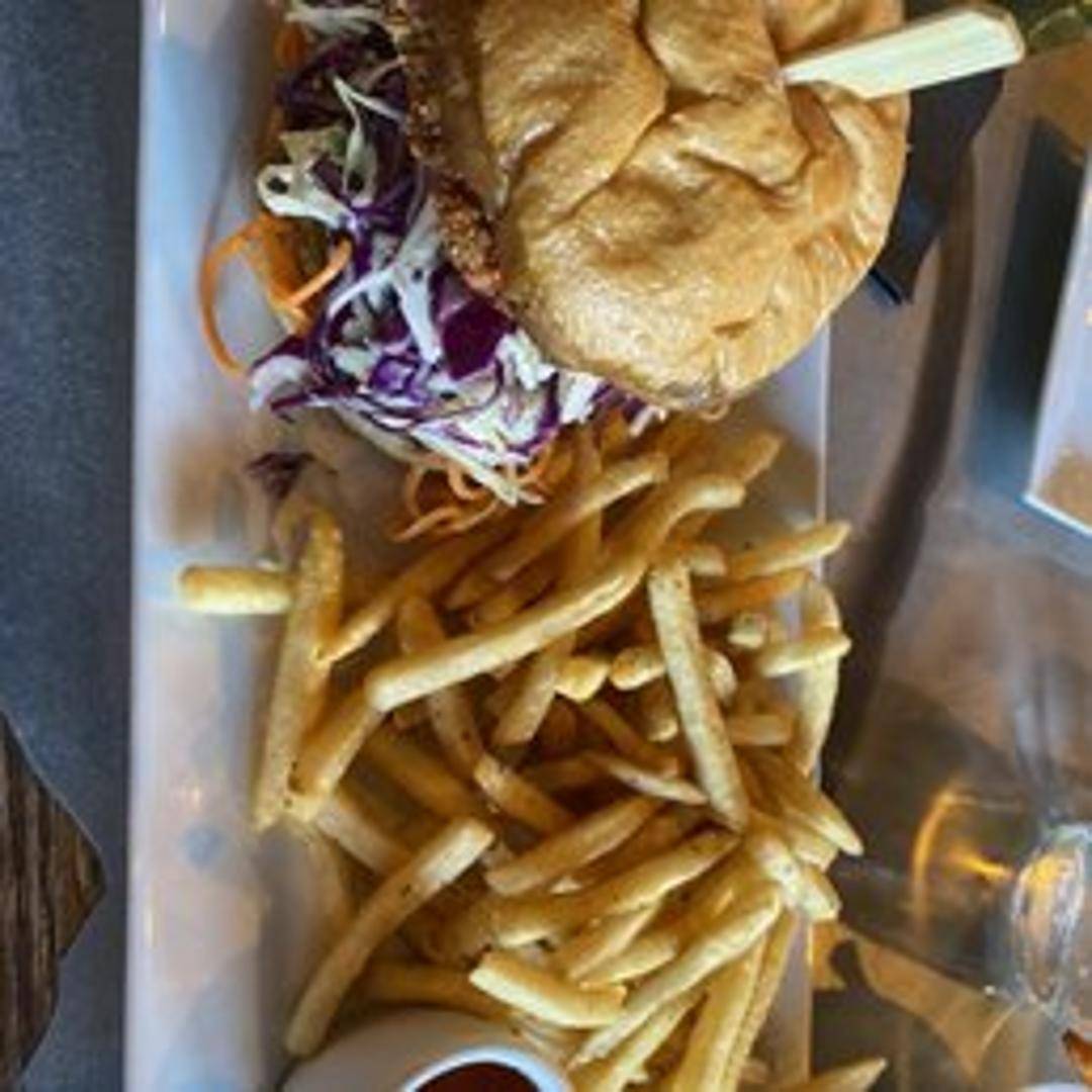 A crispy fried chicken breast coated in a spicy seasoning blend, topped with coleslaw, pickles, and a spicy aioli, served on a toasted bun.