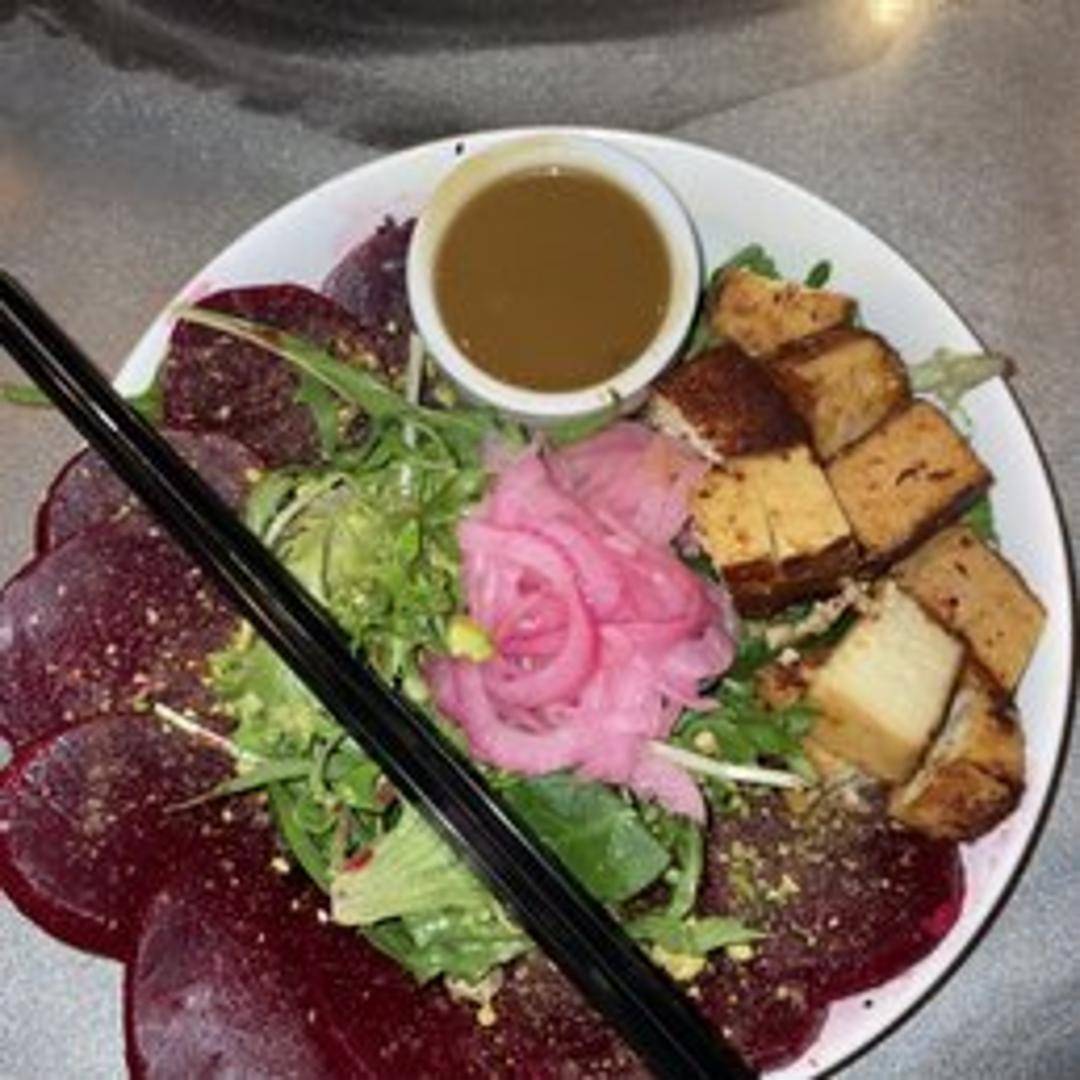A vibrant salad featuring roasted beets, often paired with mixed greens, crumbled goat cheese, candied nuts, and a light vinaigrette dressing.