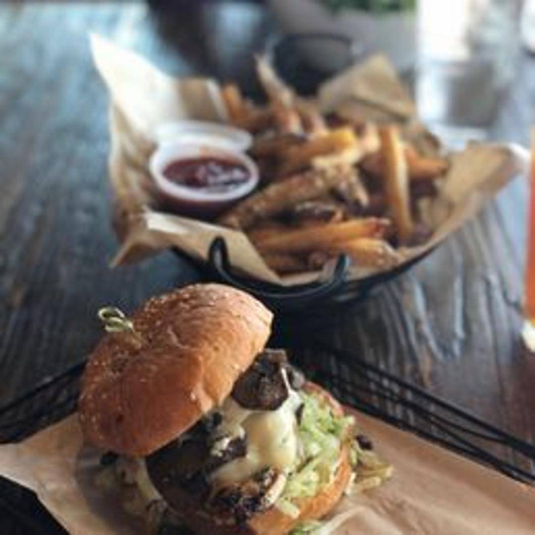 A flavorful burger featuring sautéed mushrooms, Swiss cheese, garlic aioli, and fresh lettuce and tomato.