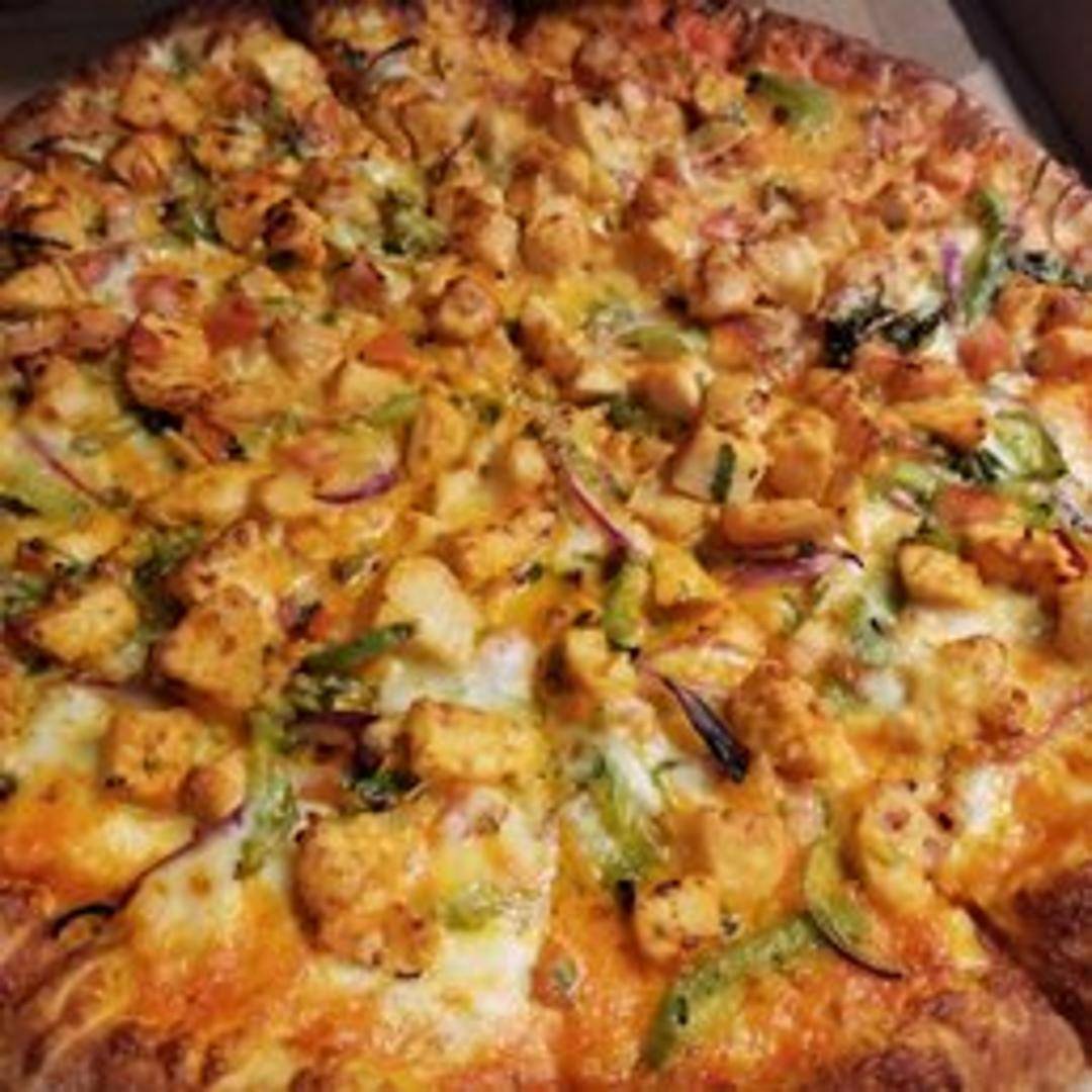 A delicious fusion pizza featuring a creamy, flavorful butter chicken sauce as the base, topped with tender pieces of marinated chicken, mozzarella cheese, and a sprinkle of cilantro. A unique and satisfying flavor combination.