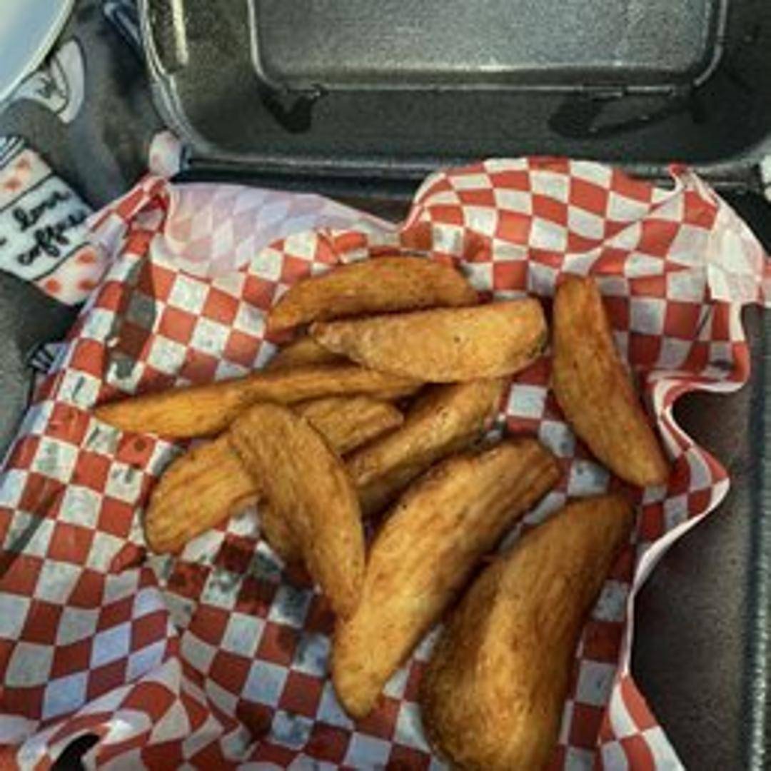 Twelve golden-brown potato wedges, seasoned and baked to a crispy exterior and fluffy interior. Served hot and ready to enjoy.