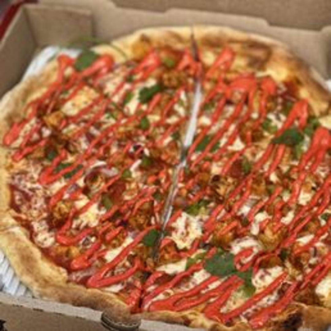 An Indian-inspired pizza featuring a rich and creamy Tikka Masala sauce, marinated chicken, and a medley of colorful vegetables. Topped with mozzarella cheese and fresh cilantro for an authentic and flavorful experience.