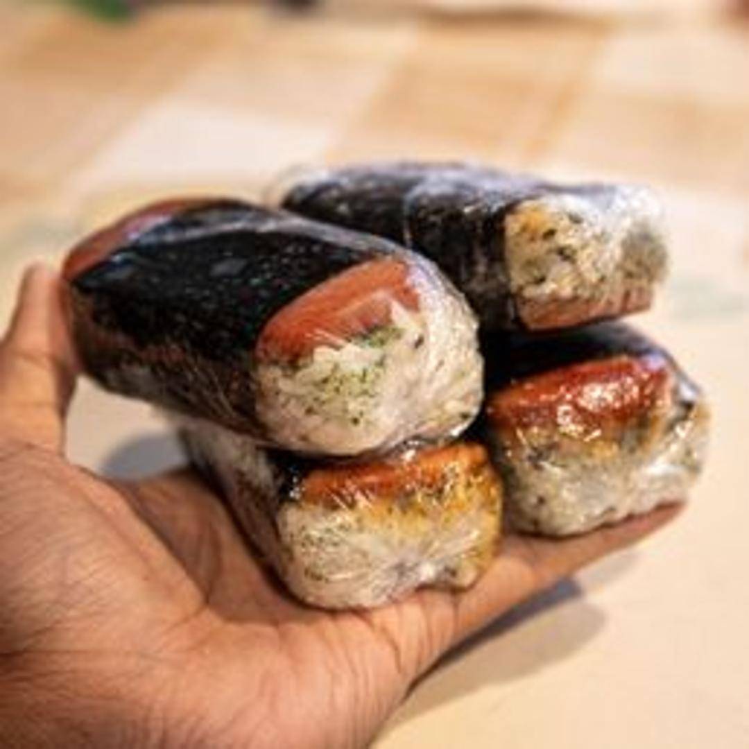 A block of rice topped with a slice of grilled Spam, wrapped in nori seaweed.