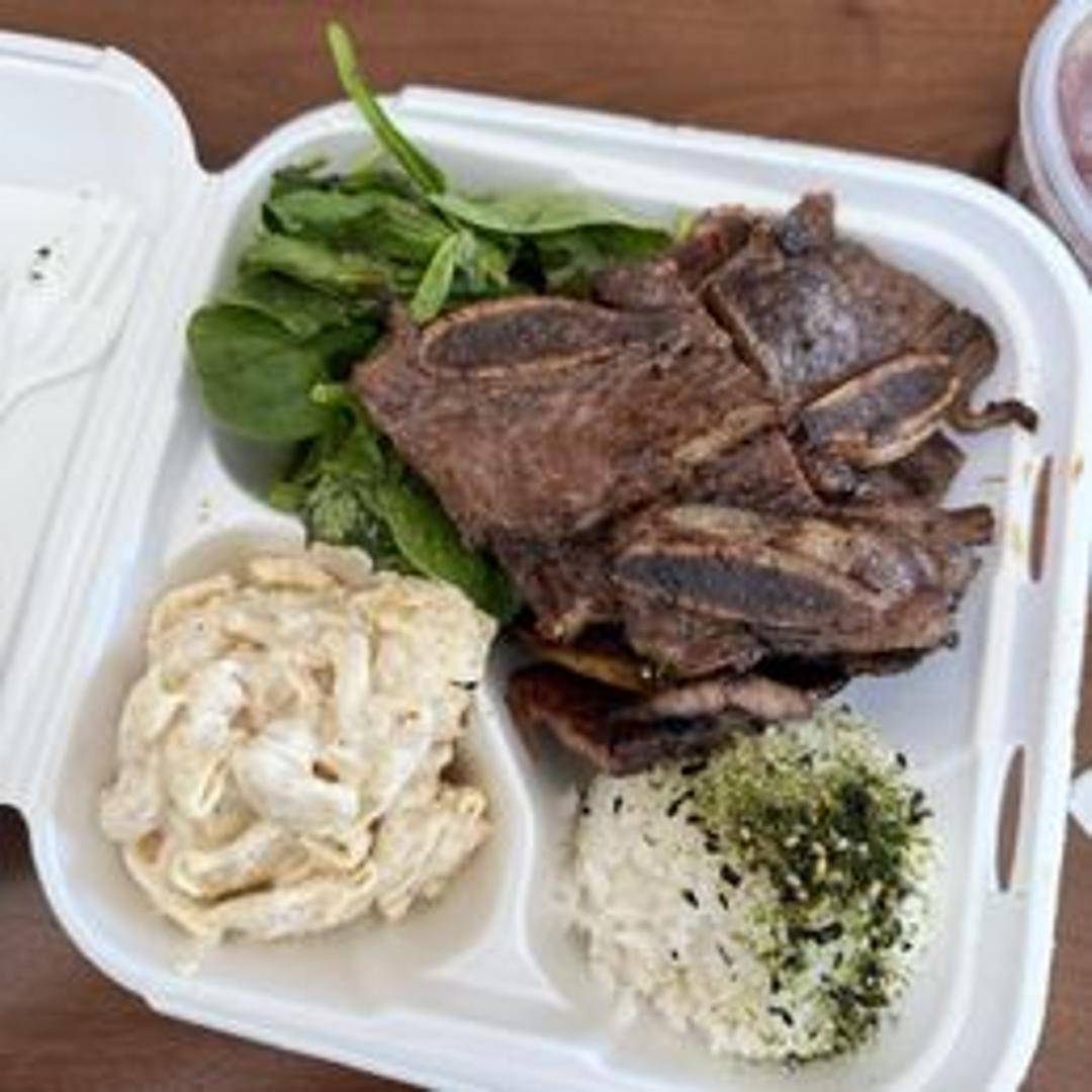 Korean-style short ribs marinated in a sweet and savory soy-based sauce, grilled and served with steamed rice and macaroni salad.