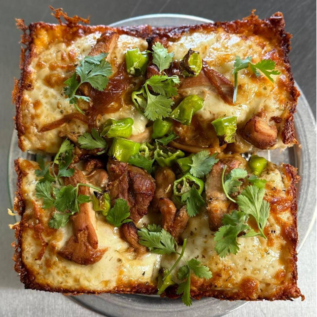CM cheese, Filipino style chicken adobo, shishito peppers, cilantro