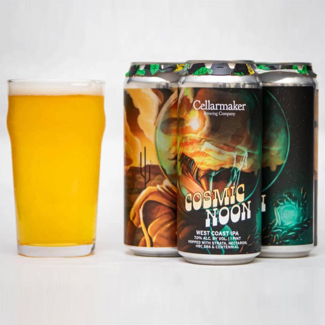 Cosmic Noon West Coast IPA • 7% ABV A clear and crisp IPA that features a combination of hops that we find truly intriguing. Strata, Nectaron, HBC 586 and Centennial create layers of deep grapefruit, sativa and dark berry flavors supported by a bright stonefruit aroma.