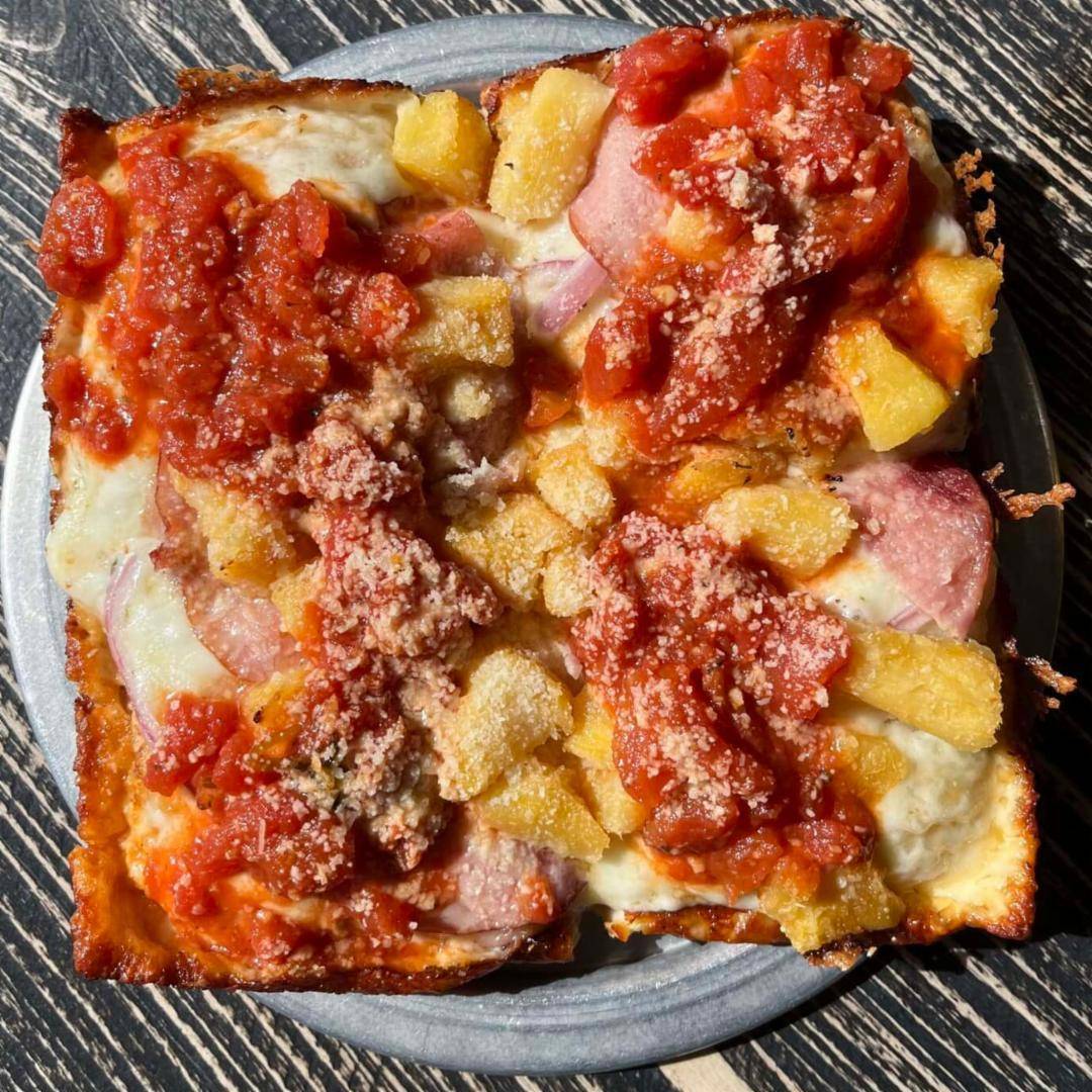 CM cheese, Canadian bacon, roasted pineapple, red onion, tomato sauce, parmesan