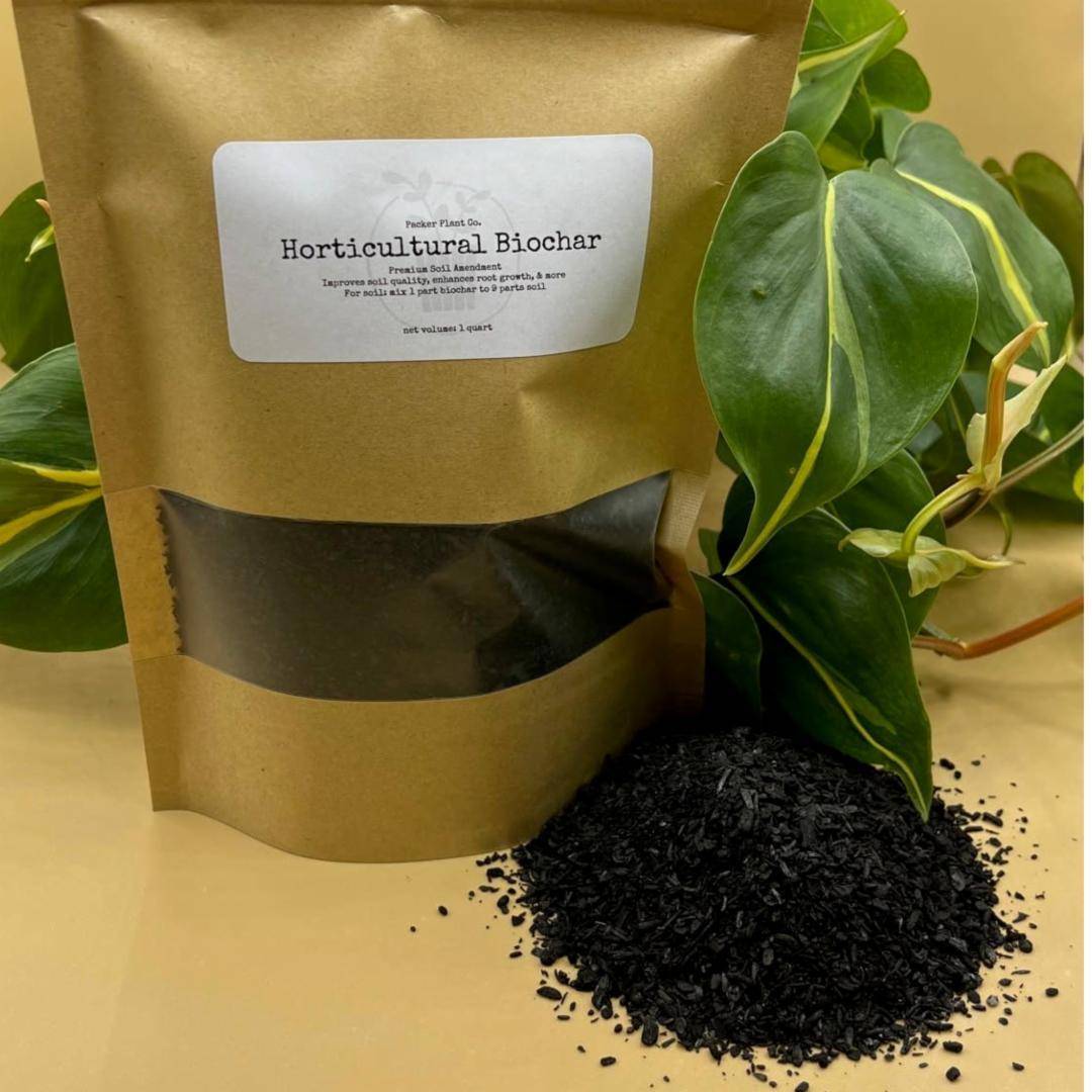 Description Our premium biochar is sustainable made in the PNW! Biochar is an amazingly beneficial soil amendment. Benefits include: -vitamins & nutrient infusion -fast root growth -reduced risk of root rot due to moisture wicking -purifying & cleansing effect Our biochar is very low dust and the perfect size for terrariums as well! Mix 1 part biochar to 9 parts soil for the perfect blend. Each bag contains 1 quart by volume.