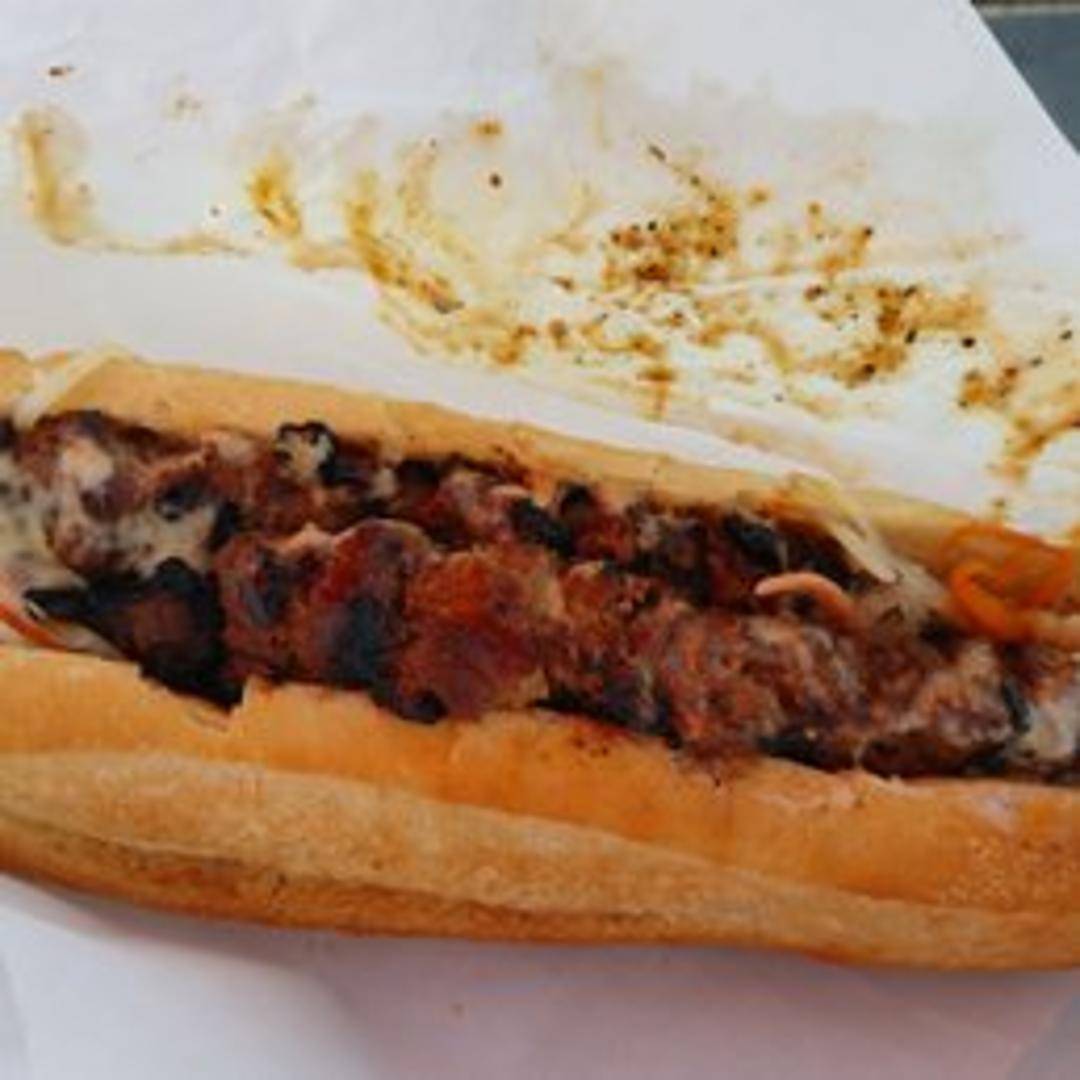A savory sandwich featuring grilled beef sticks, often served on a baguette or similar roll with pickled vegetables, cilantro, and a flavorful sauce.