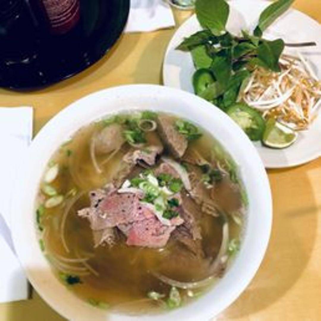 Classic Vietnamese beef noodle soup. A rich and flavorful beef broth simmered with tender slices of beef, rice noodles, and aromatic spices. Garnished with bean sprouts, basil, lime, and jalapenos.