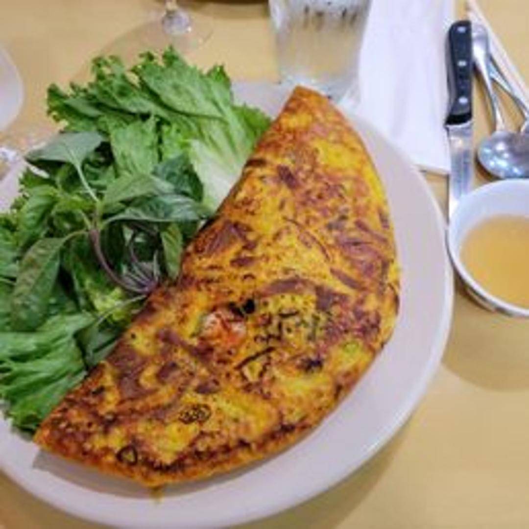 A savory, crispy crepe made from rice flour, coconut milk, and turmeric. Typically filled with shrimp, pork, bean sprouts, and onions. Served with fresh herbs and a dipping sauce, usually nuoc cham (fish sauce-based dipping sauce).