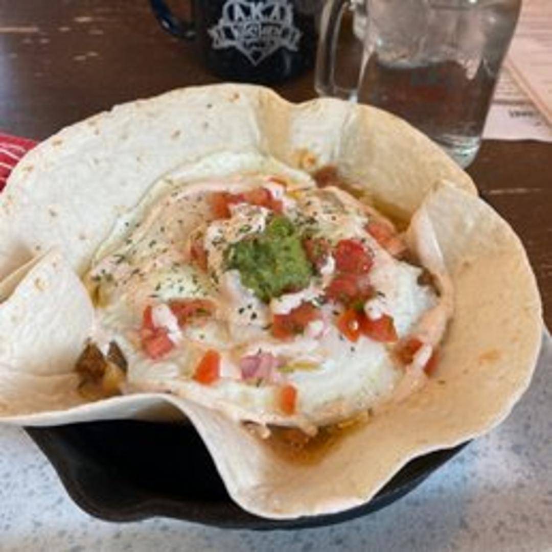 Two fried eggs served on top of crispy corn tortillas, smothered in ranchero sauce and topped with cheese. Served with refried beans and your choice of side.