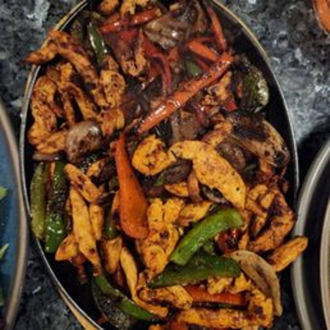 Strips of marinated chicken grilled with bell peppers and onions. Served sizzling hot with warm tortillas, sour cream, guacamole, and pico de gallo for building your own fajitas.