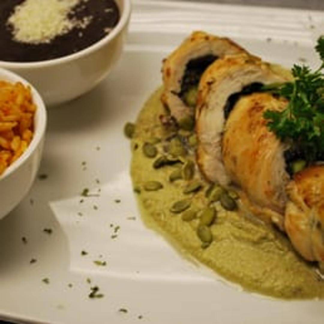 Chicken breast stuffed and simmered in a vibrant and savory green mole sauce. Served with traditional accompaniments.