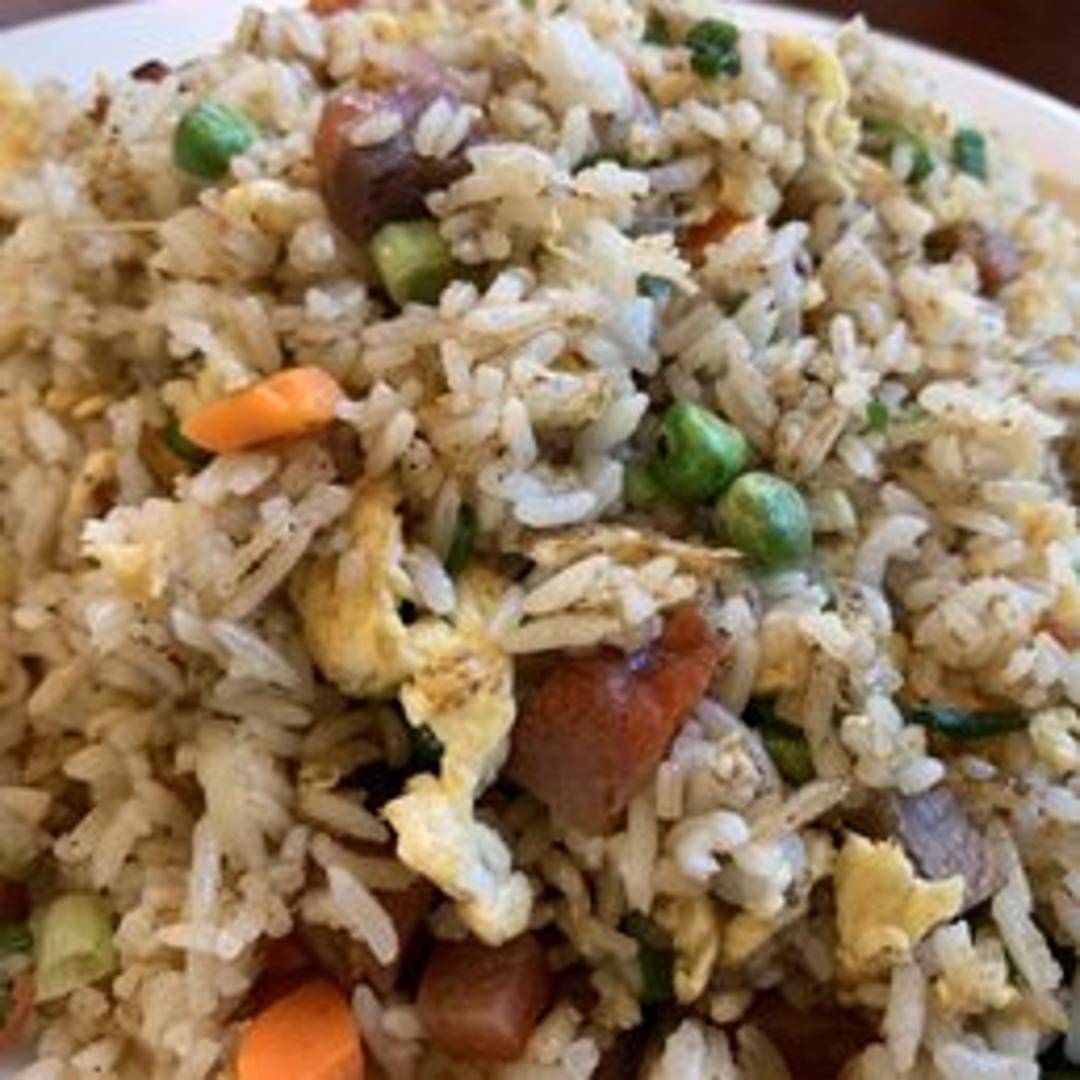 Savory fried rice featuring diced BBQ pork (Char Siu), fluffy rice, scrambled egg, peas, carrots, and onions, stir-fried in a light soy sauce. A flavorful and filling dish.