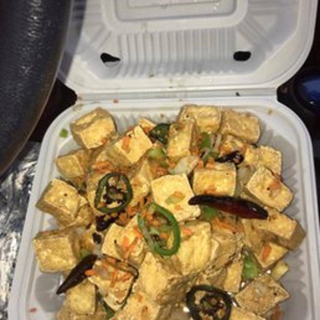 Crispy, golden-brown tofu seasoned with a fragrant blend of salt, pepper, and aromatic spices. Lightly battered and fried to perfection for a satisfyingly crunchy exterior and a soft interior. Garnished with green onions and chili peppers.