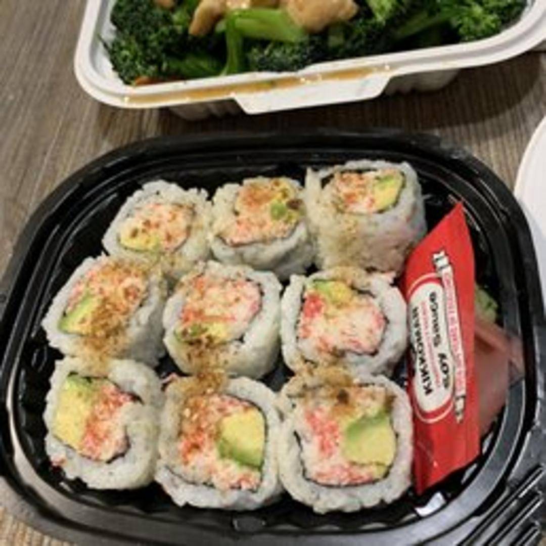 A popular sushi roll consisting of imitation crab meat, avocado, cucumber, and rolled with seasoned rice and seaweed. Often topped with sesame seeds and served with soy sauce, ginger, and wasabi.