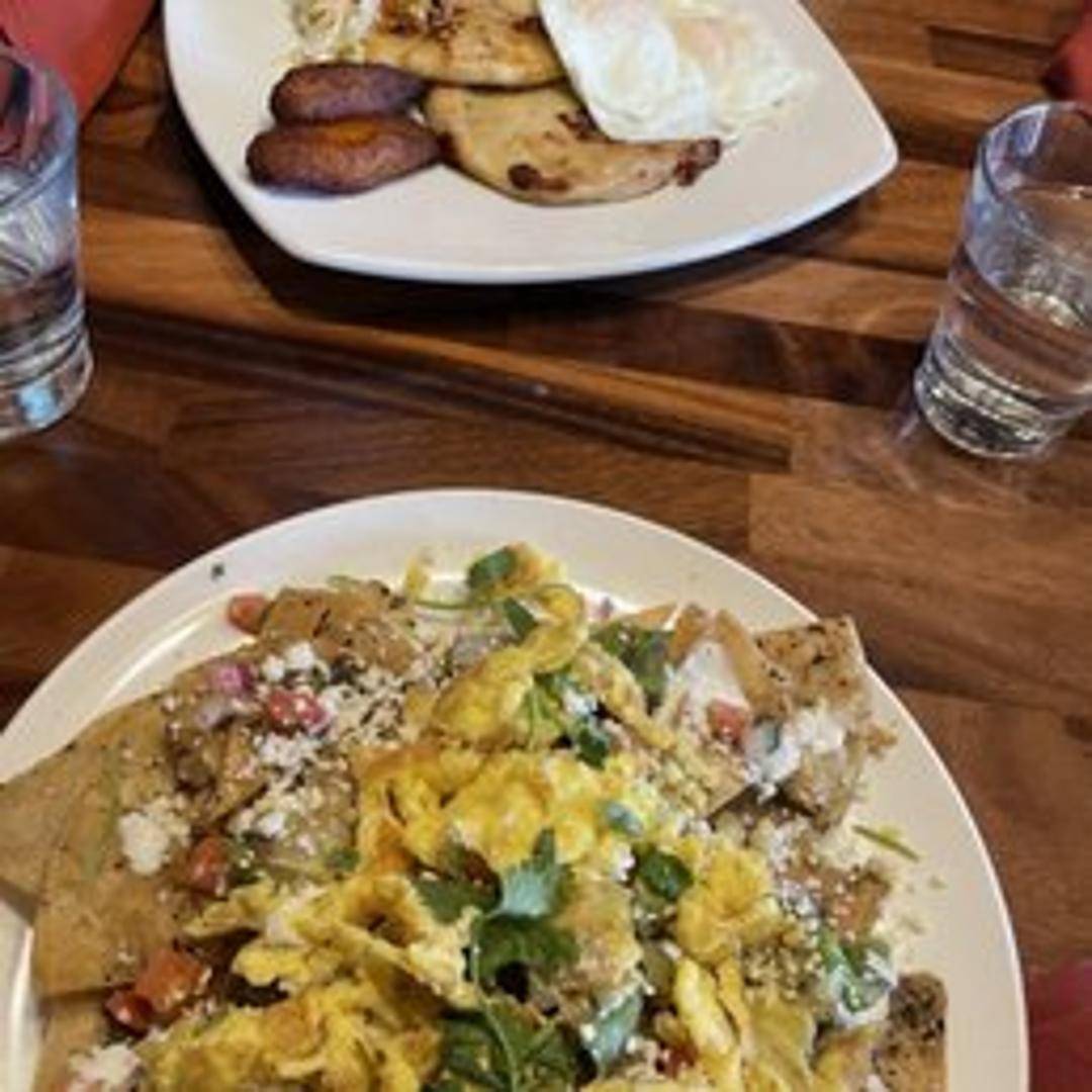 Crispy tortilla chips simmered in salsa verde, topped with scrambled eggs, queso fresco, crema, and pickled onions.