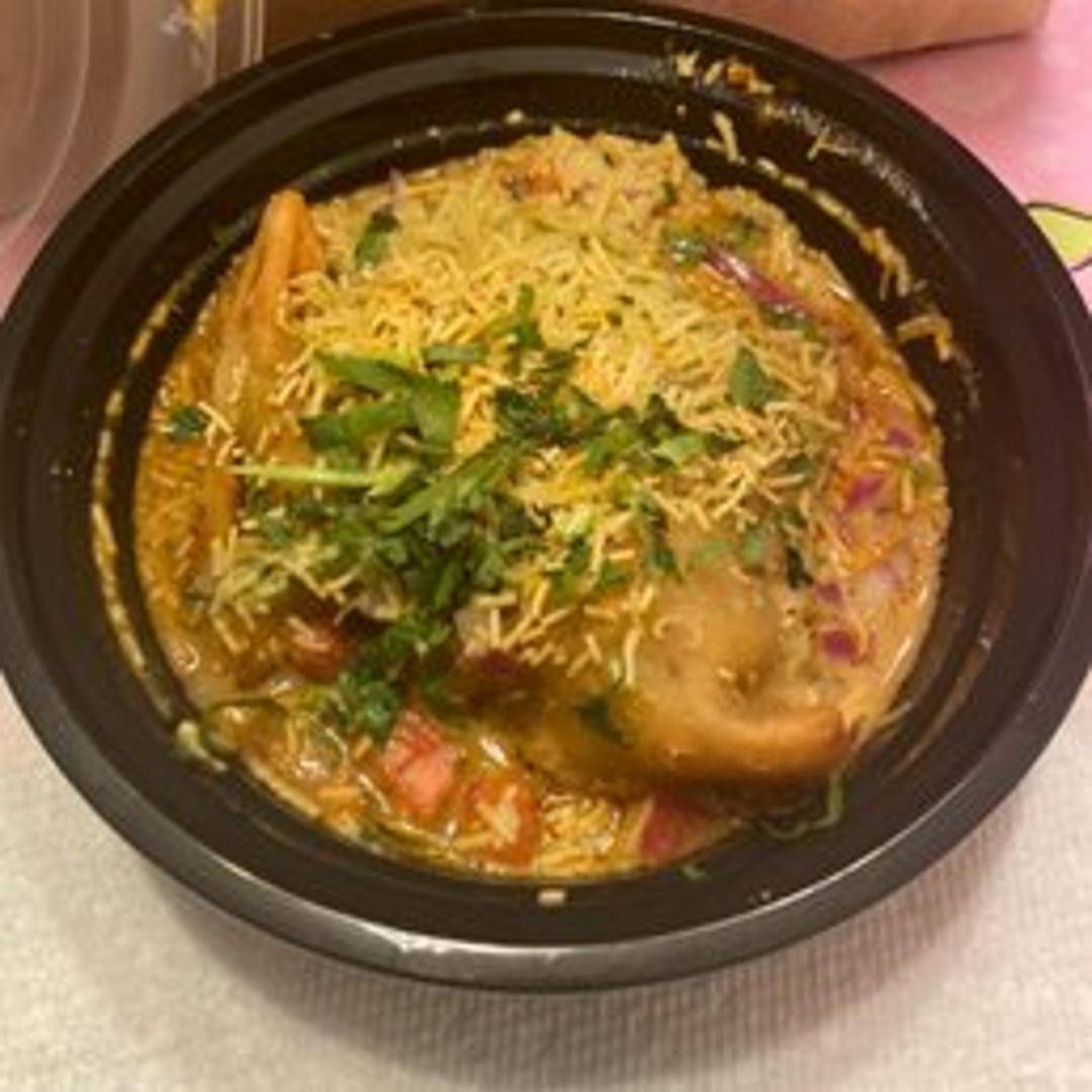 A delightful and popular Indian street food, Samosa Chaat features deconstructed crispy samosas topped with savory chana masala (chickpea curry), cooling yogurt, tangy tamarind chutney, spicy mint chutney, and a sprinkle of fresh onions, cilantro, and various spices for a burst of flavors and textures.