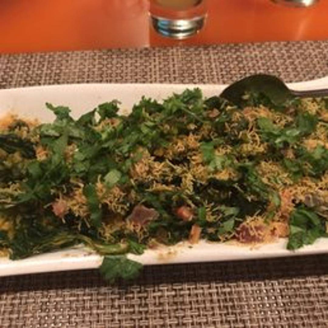 A creative and vibrant twist on traditional Indian street food, Baby Spinach Chaat features lightly fried or crispy baby spinach leaves, artfully layered with a combination of sweet yogurt, tangy tamarind chutney, spicy mint chutney, and a sprinkle of various chaat masalas and fresh herbs, offering a delightful crunch with every bite.