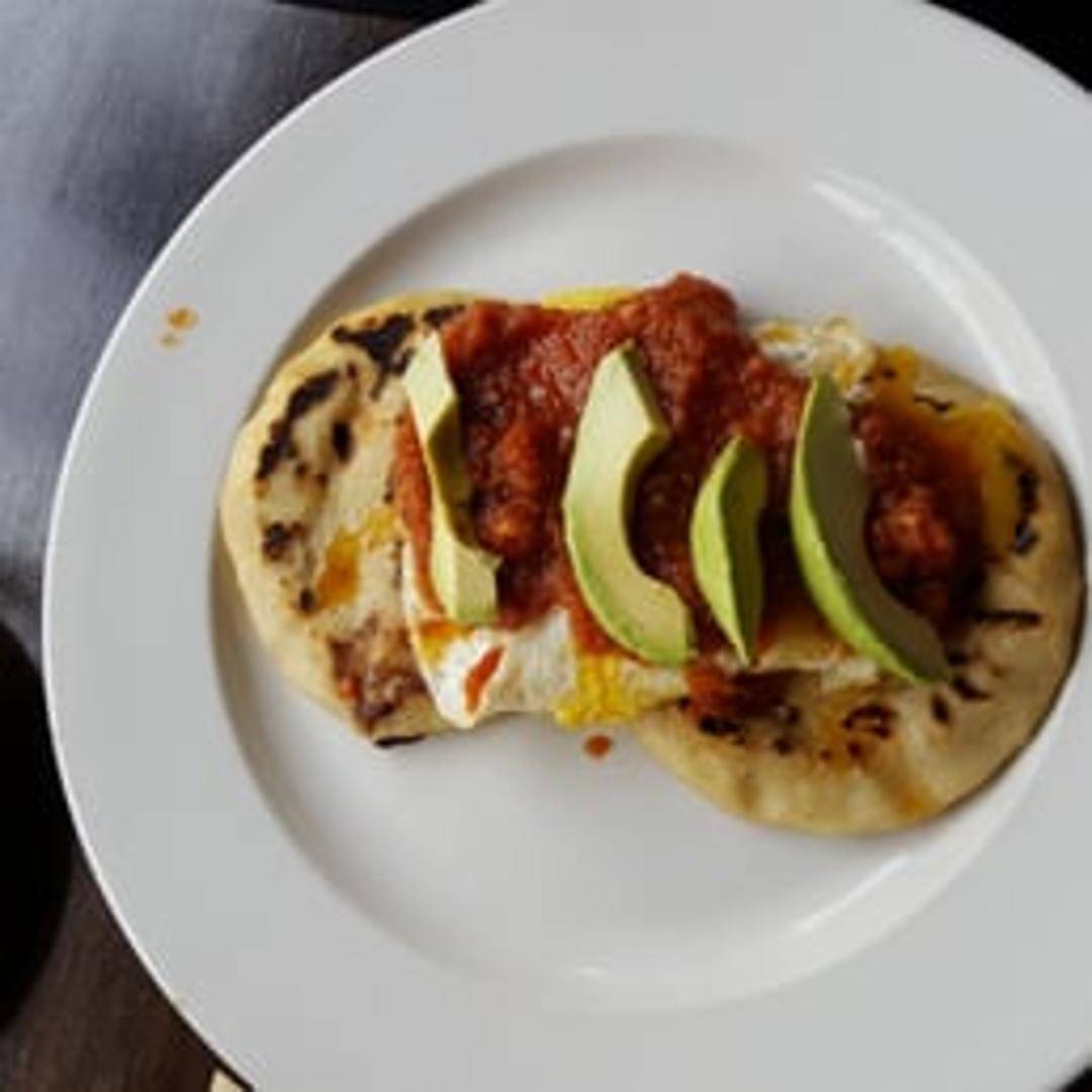 Two handmade corn tortillas stuffed with your choice of fillings such as cheese, beans, pork, or loroco, served with curtido (cabbage slaw) and salsa roja. Available with breakfast fillings like scrambled eggs and chorizo.