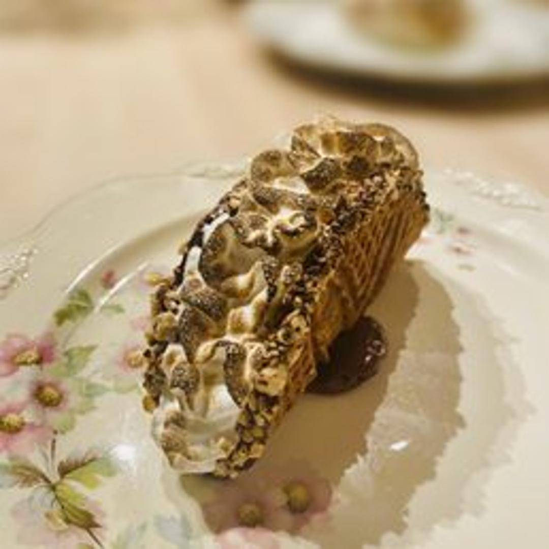 A playful and indulgent dessert. A crispy taco shell filled with rich chocolate cocoa, toasted marshmallows, graham cracker crumbles, and a drizzle of chocolate sauce. A sweet and satisfying treat.