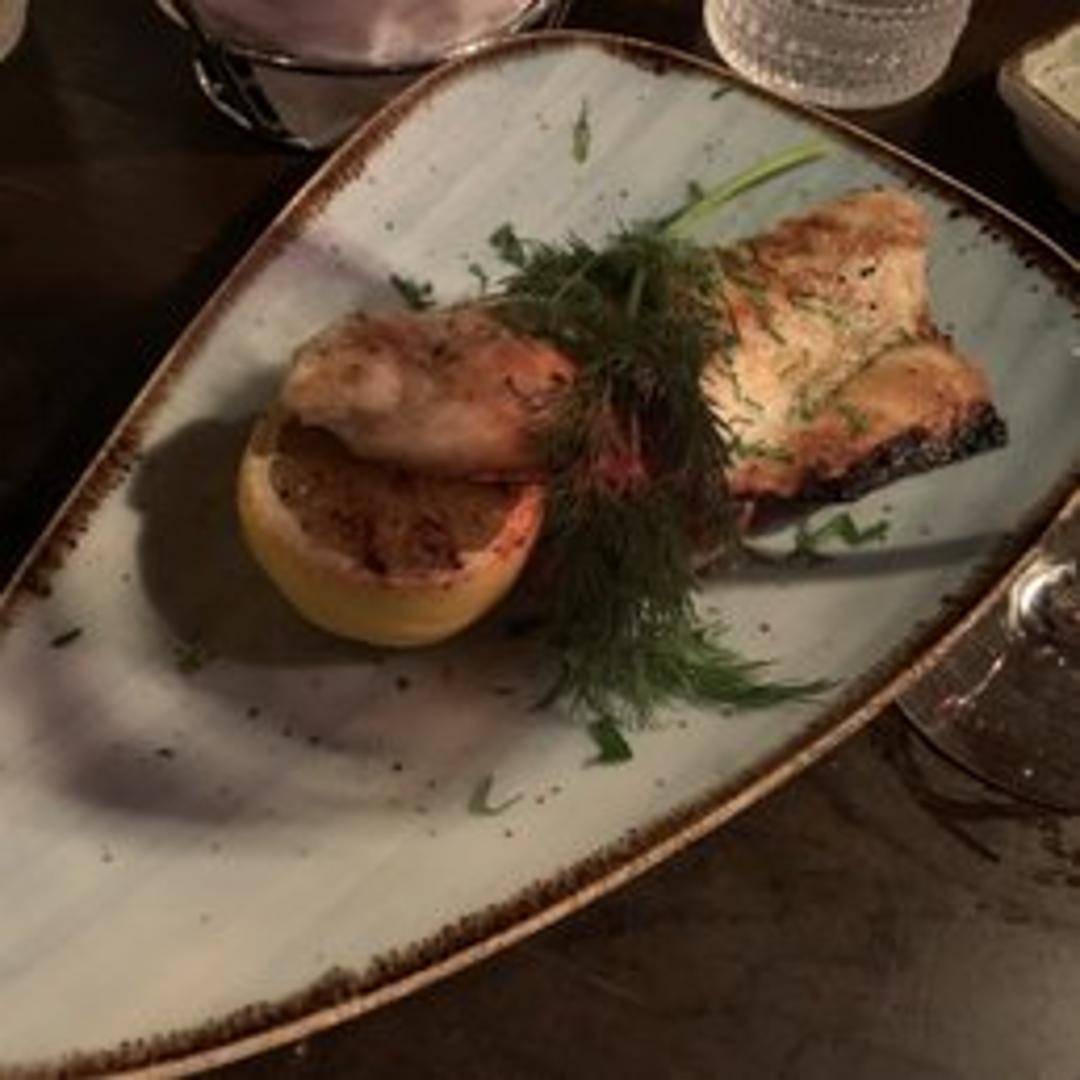 A whole Mediterranean sea bass, expertly grilled to flaky perfection, preserving its delicate texture and mild, sweet flavor. Infused with fresh lemon, aromatic oregano, and a touch of sea salt, it's presented simply to highlight the natural essence of this beloved fish.