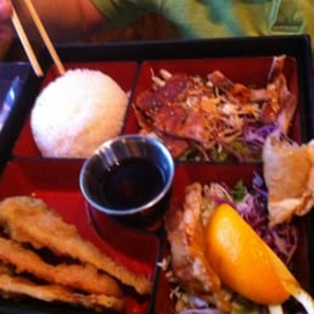 A complete meal featuring a variety of items such as rice, a main dish (e.g., teriyaki chicken, tempura), sushi rolls, and assorted side dishes in a divided container.