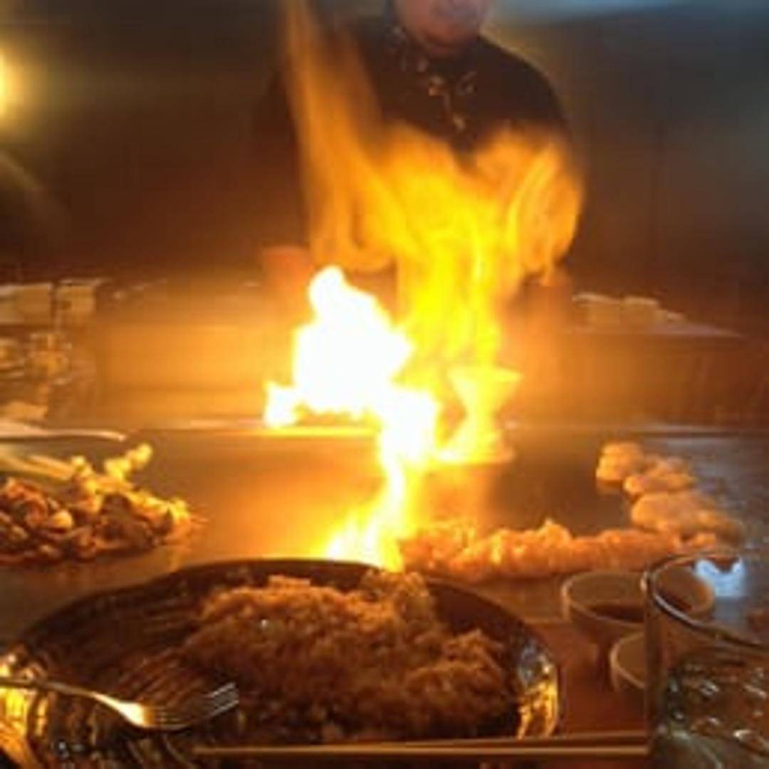 A selection of proteins and vegetables cooked on a flat iron grill with traditional Japanese sauces and seasonings, served with steamed rice.