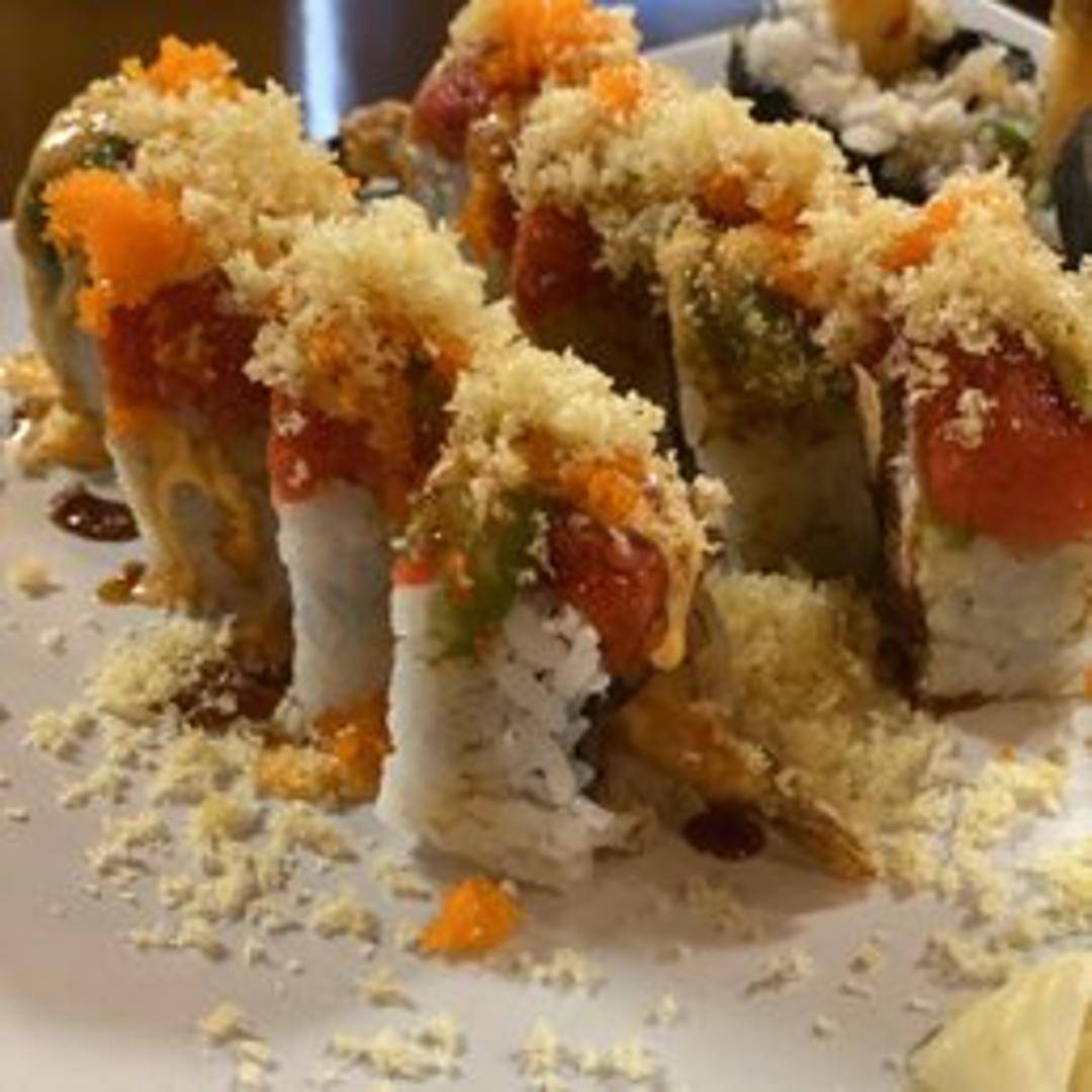 Spicy tuna and cucumber roll, topped with avocado, eel sauce, and crunchy flakes.